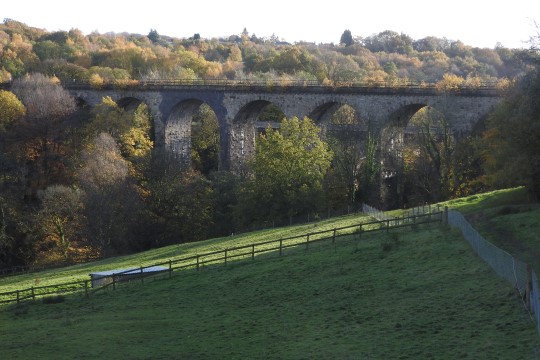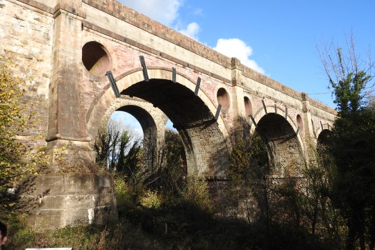 The impressive 1861 Marple railway viaduct with the aqueduct visible between the arches