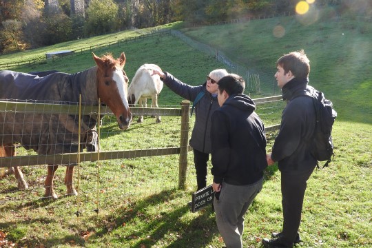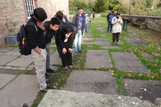 Inspecting gravestones at Chadkirk chapel. Some date back to around 1750.